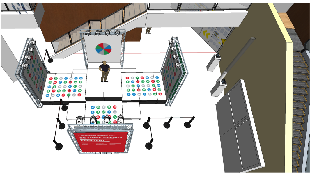 Communication agency ICF Mostra worked jointly together with Manythink and divided the available space into two zones: one that would inform the audience, and a second one that would engage the audience in a game. Inspired by the famous game Twister, we developed a similar game that involved hands and feet to take concrete, positive, and accessible actions to fight climate change.