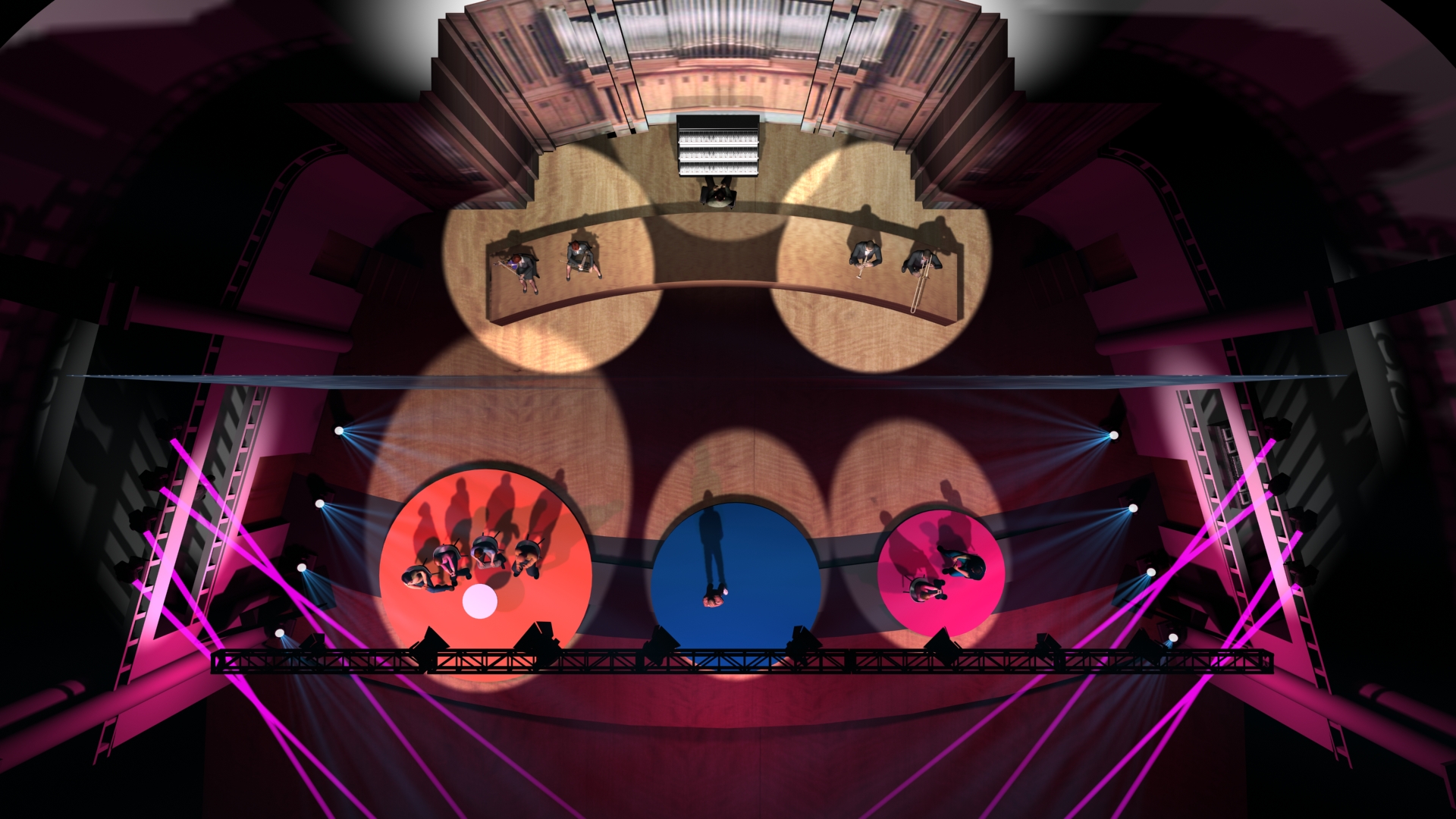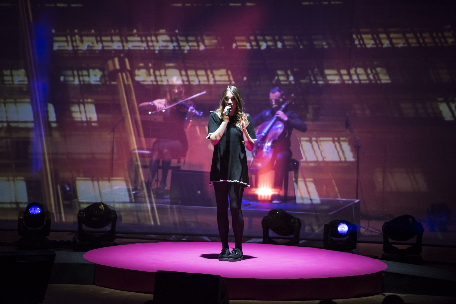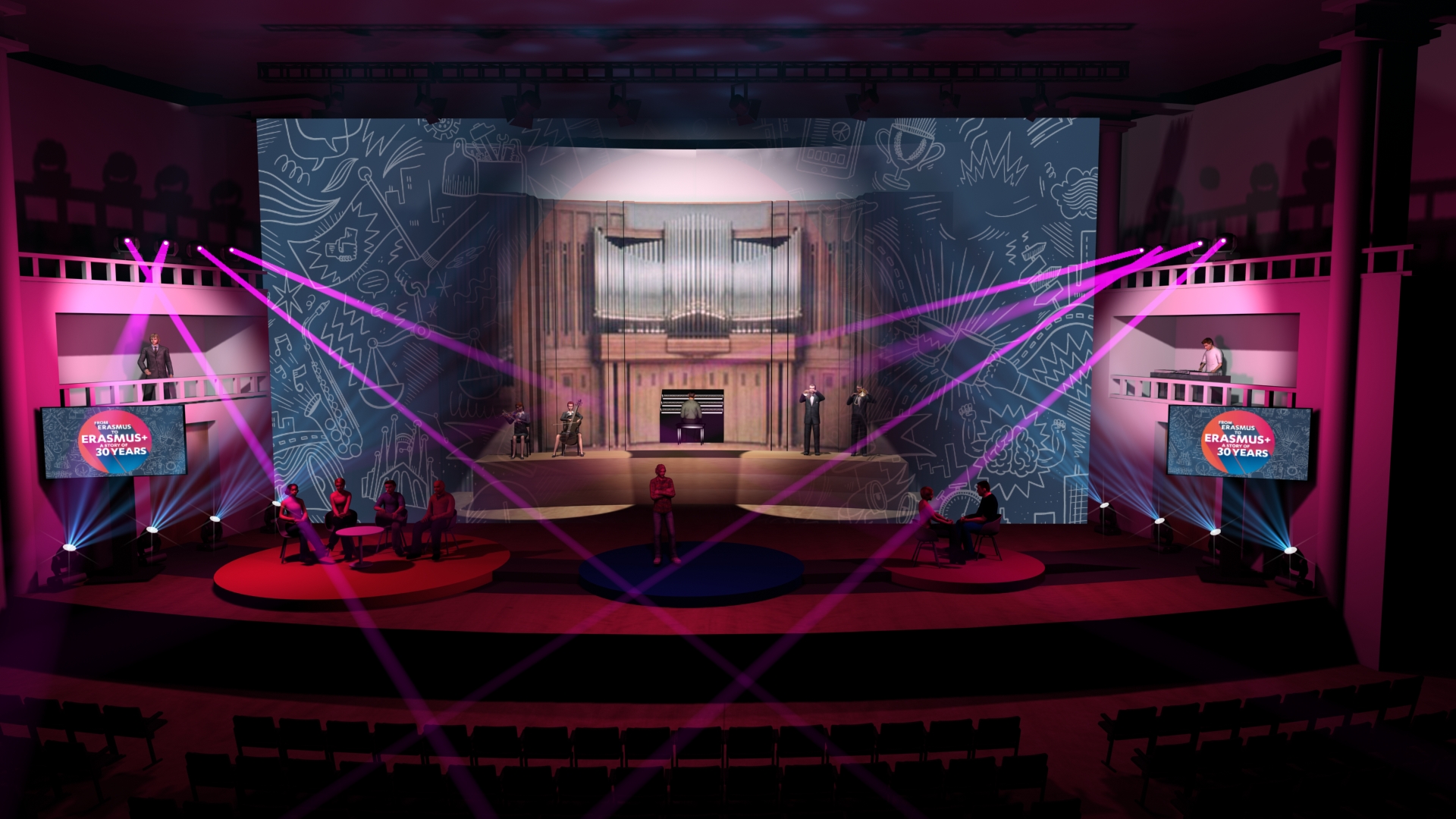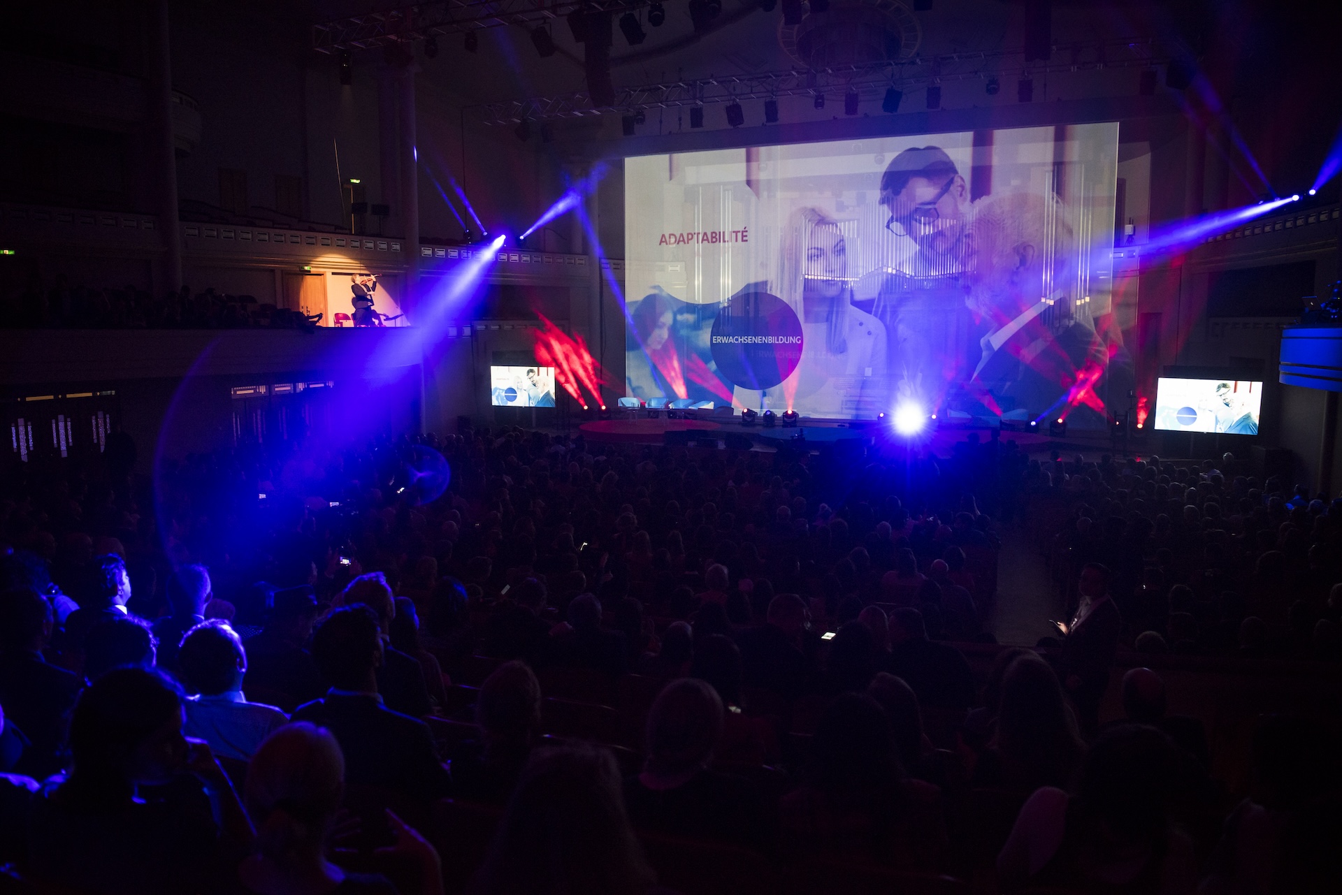 The stage design is centered around a large semi-transparent screen that allows for playing with foreground and background elements while ensuring high-quality projection. The stage design and show direction contributed to maintaining coherence throughout this anniversary ceremony, which took place in the prestigious Henry Leboeuf Hall at Bozar.