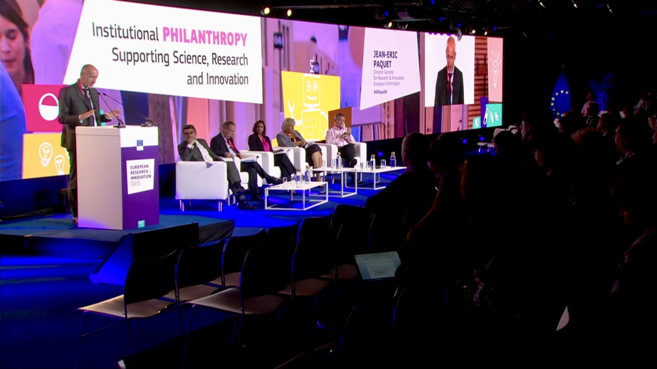 European Research & Innovation Days Communication Design Scenography Design, Graphic Design, Field Services The 2019 R&I Days took place at the Kanal. Manythink worked on the signage, the screen design and directed the show during the plenary sessions.