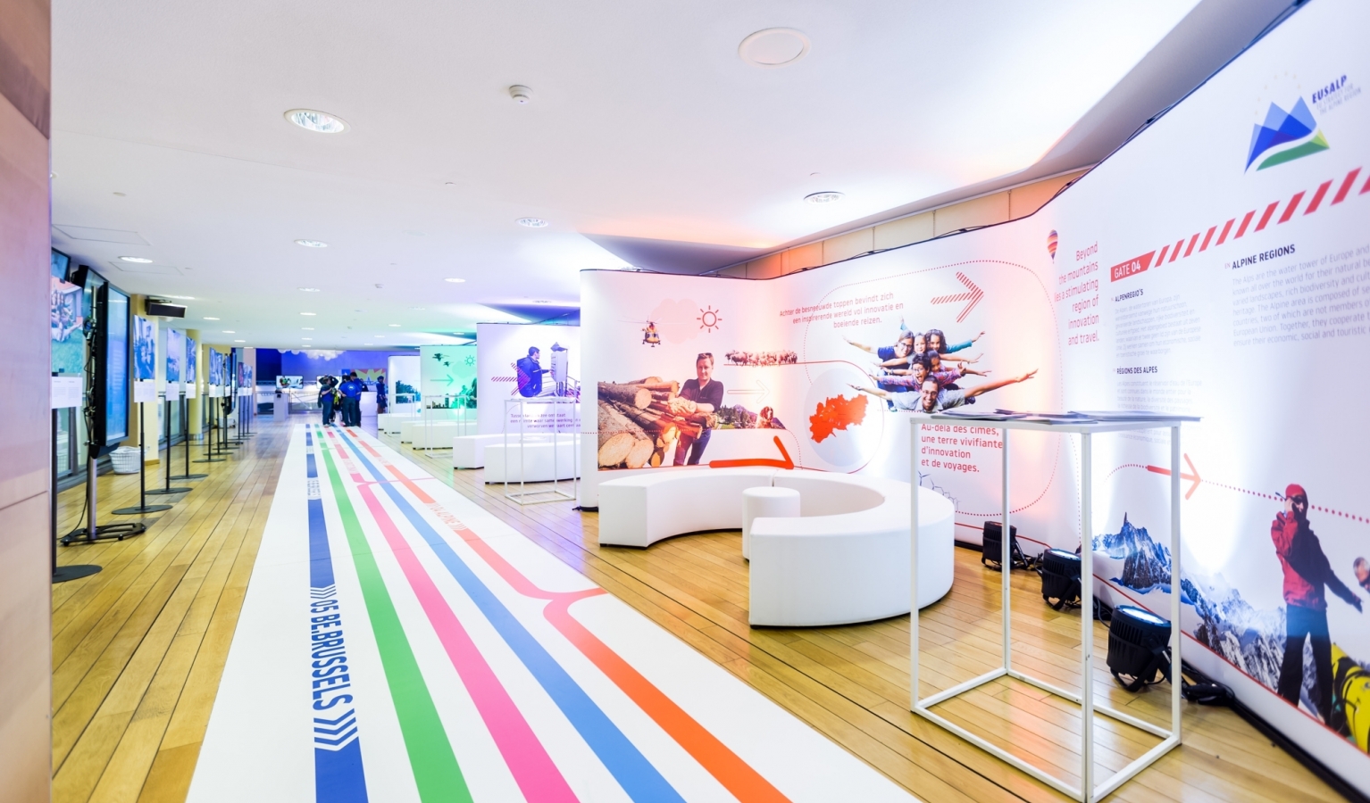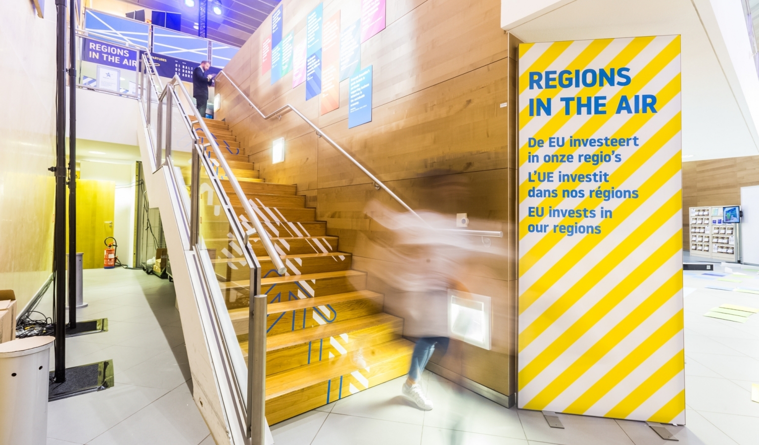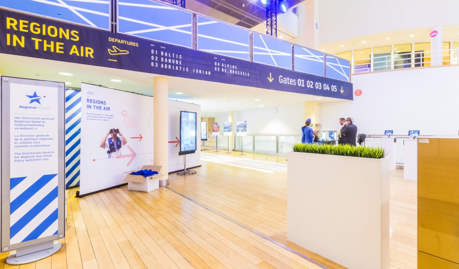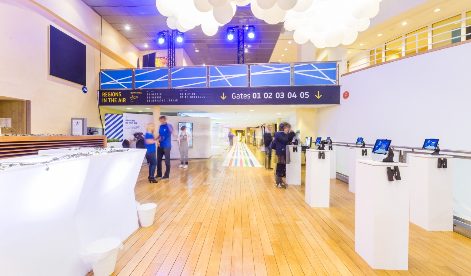 Manythink transformed the ground floor of the iconic Berlaymont building into an "airport departure hall" bringing the Regions in the Air, where specific regional projects were highlighted in several information booths.