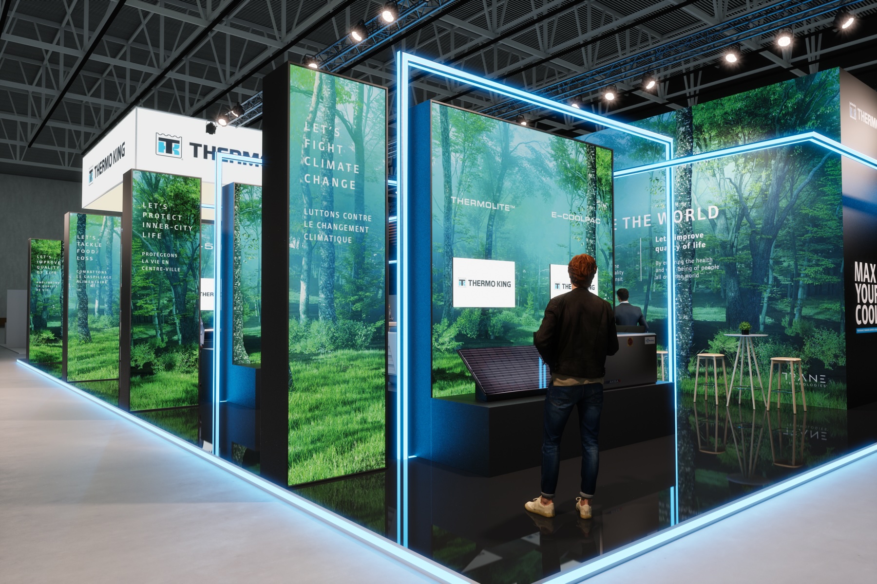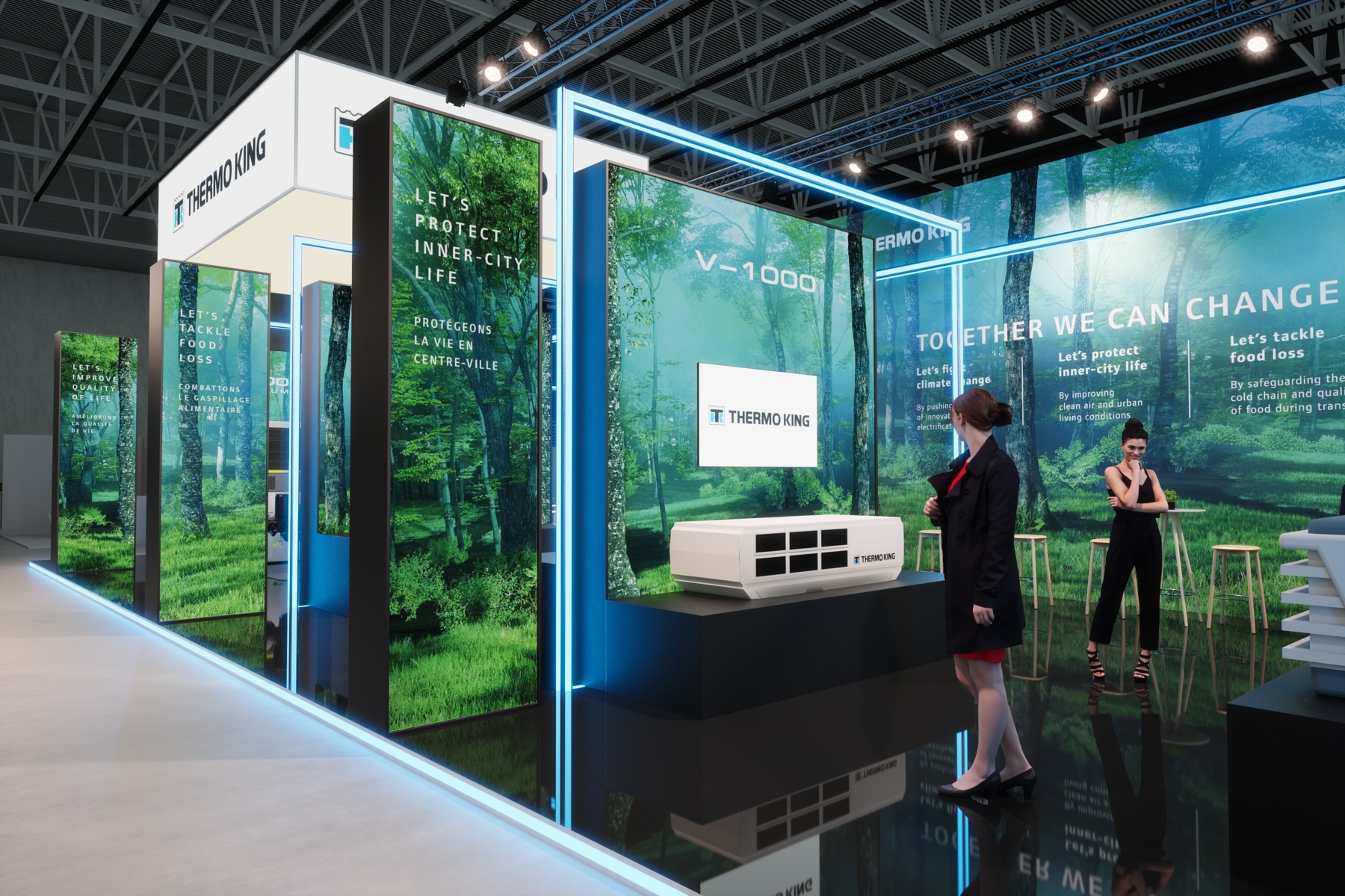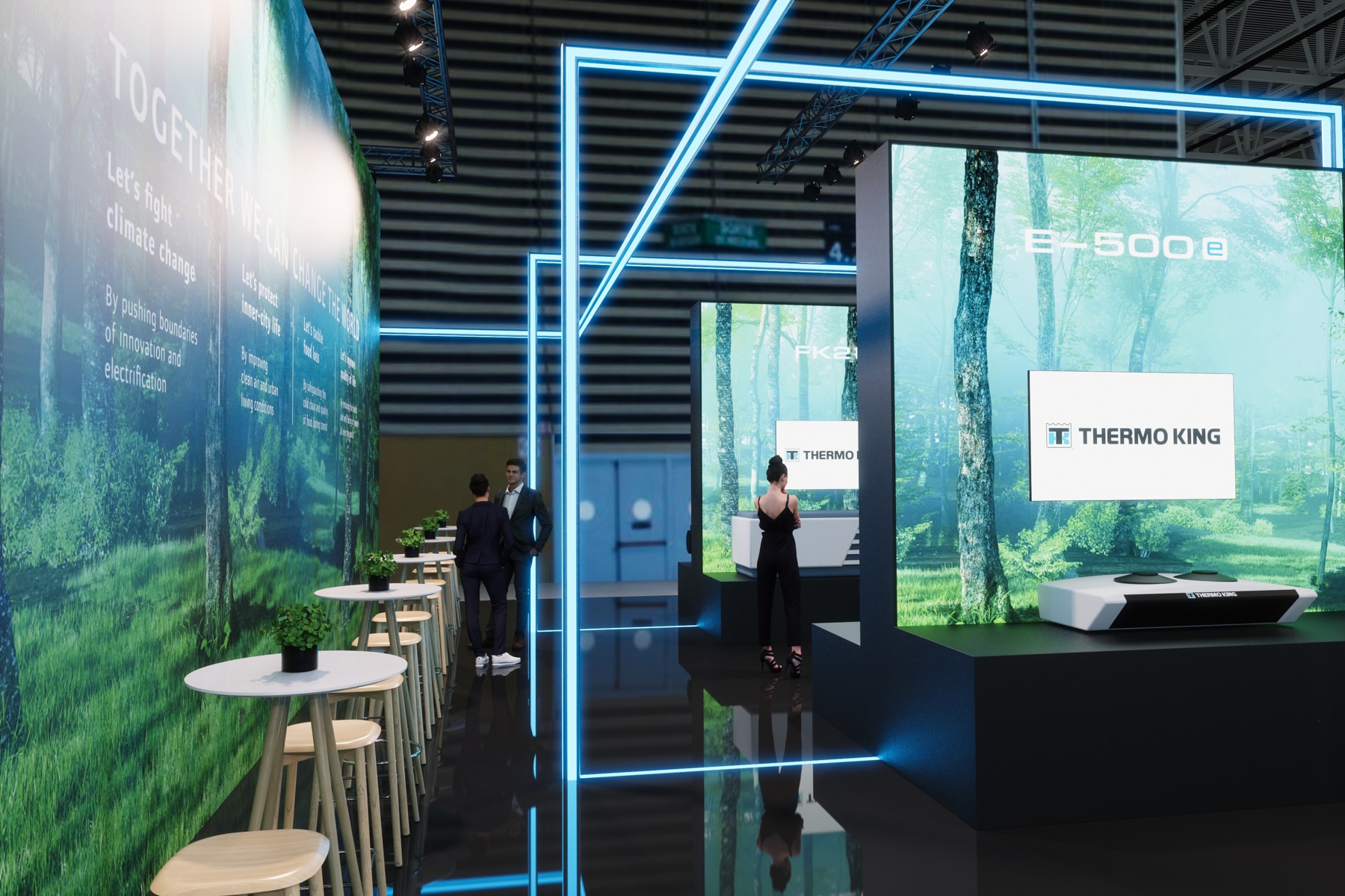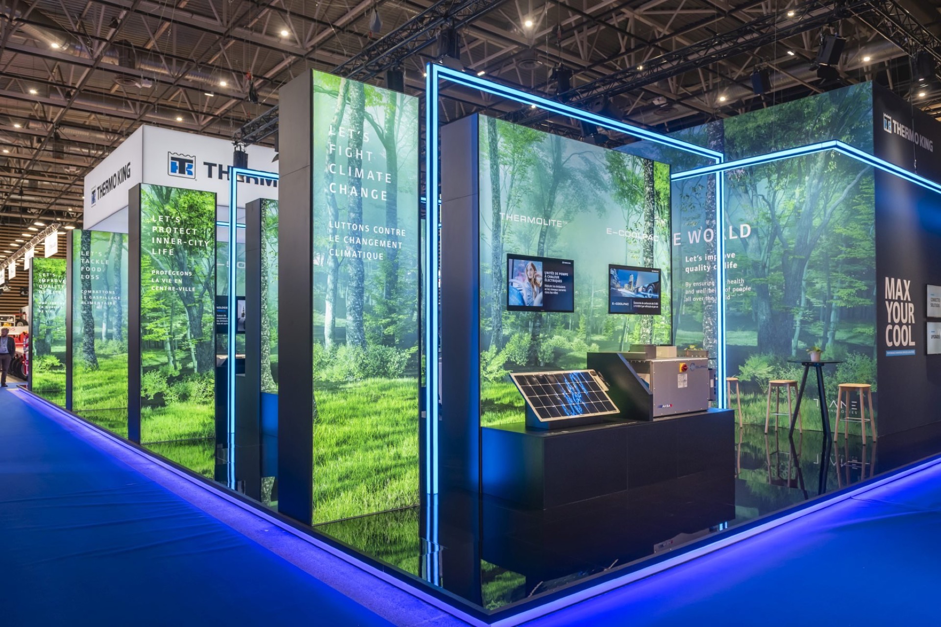 MANYTHINK, as the concept designer, envisioned a light stand design that emphasizes the "all electric" commitment of Thermo King. Featuring LED lines surrounding the units, mirroring on the glossy floor, they guide you through an electric world, intersecting like a drive through the city and suburbs. LED walls add dynamic movement, capturing the essence of refrigeration transport. Enter the e-Zone and change the world!