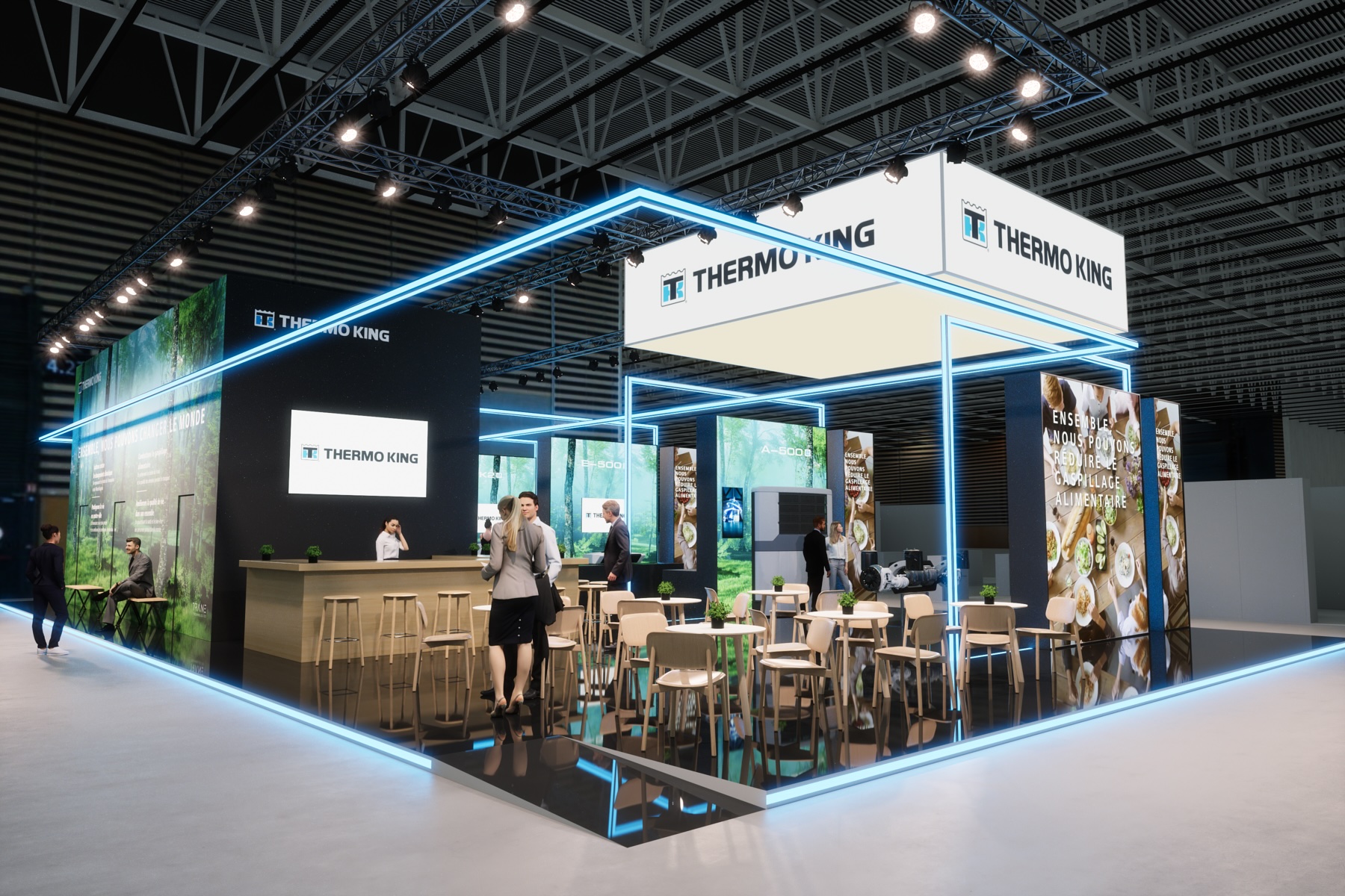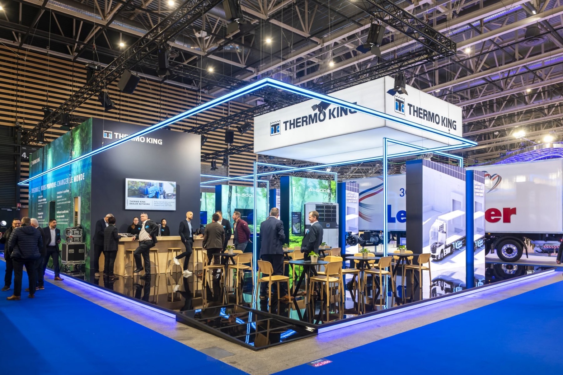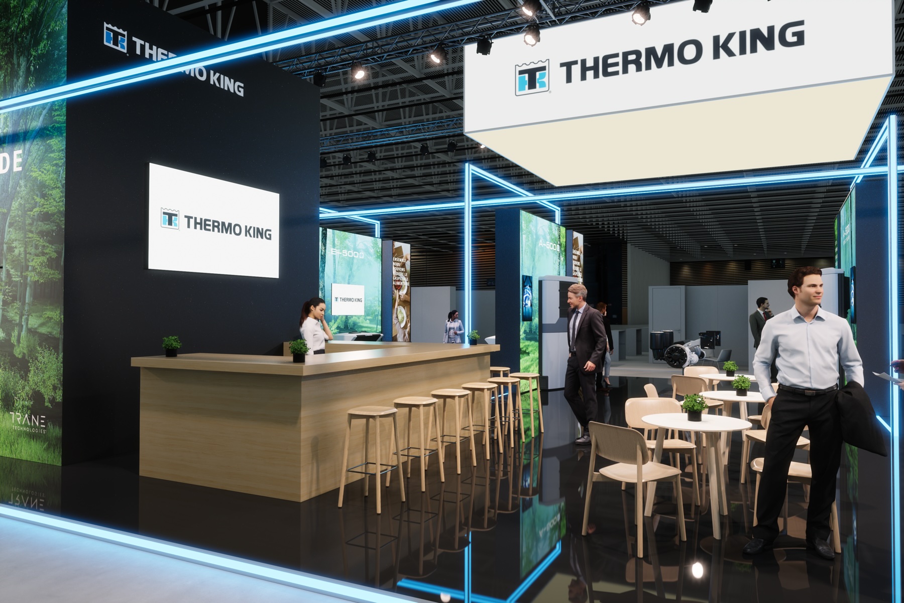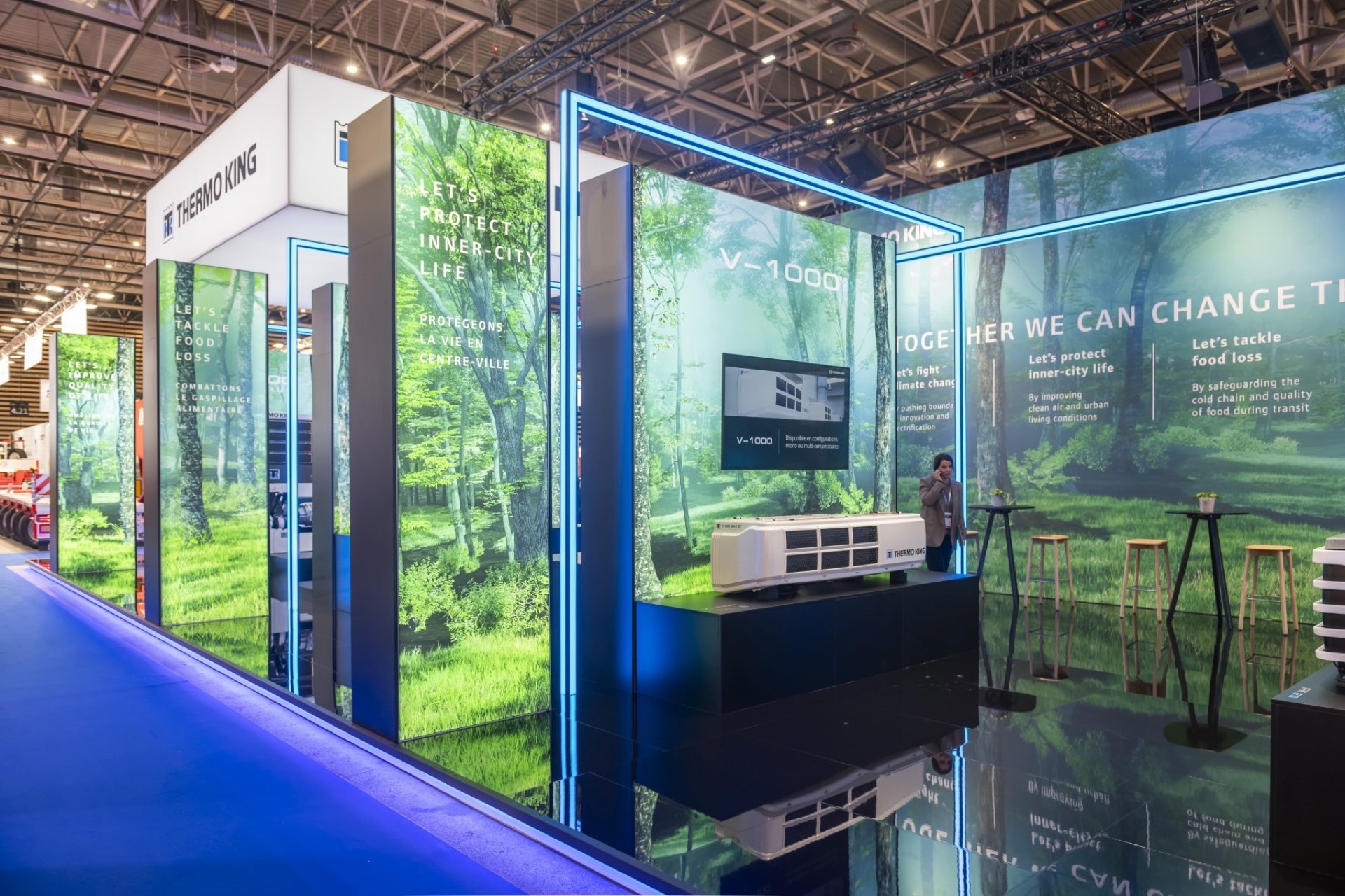 MANYTHINK, as the concept designer, envisioned a light stand design that emphasizes the "all electric" commitment of Thermo King. Featuring LED lines surrounding the units, mirroring on the glossy floor, they guide you through an electric world, intersecting like a drive through the city and suburbs. LED walls add dynamic movement, capturing the essence of refrigeration transport. Enter the e-Zone and change the world!