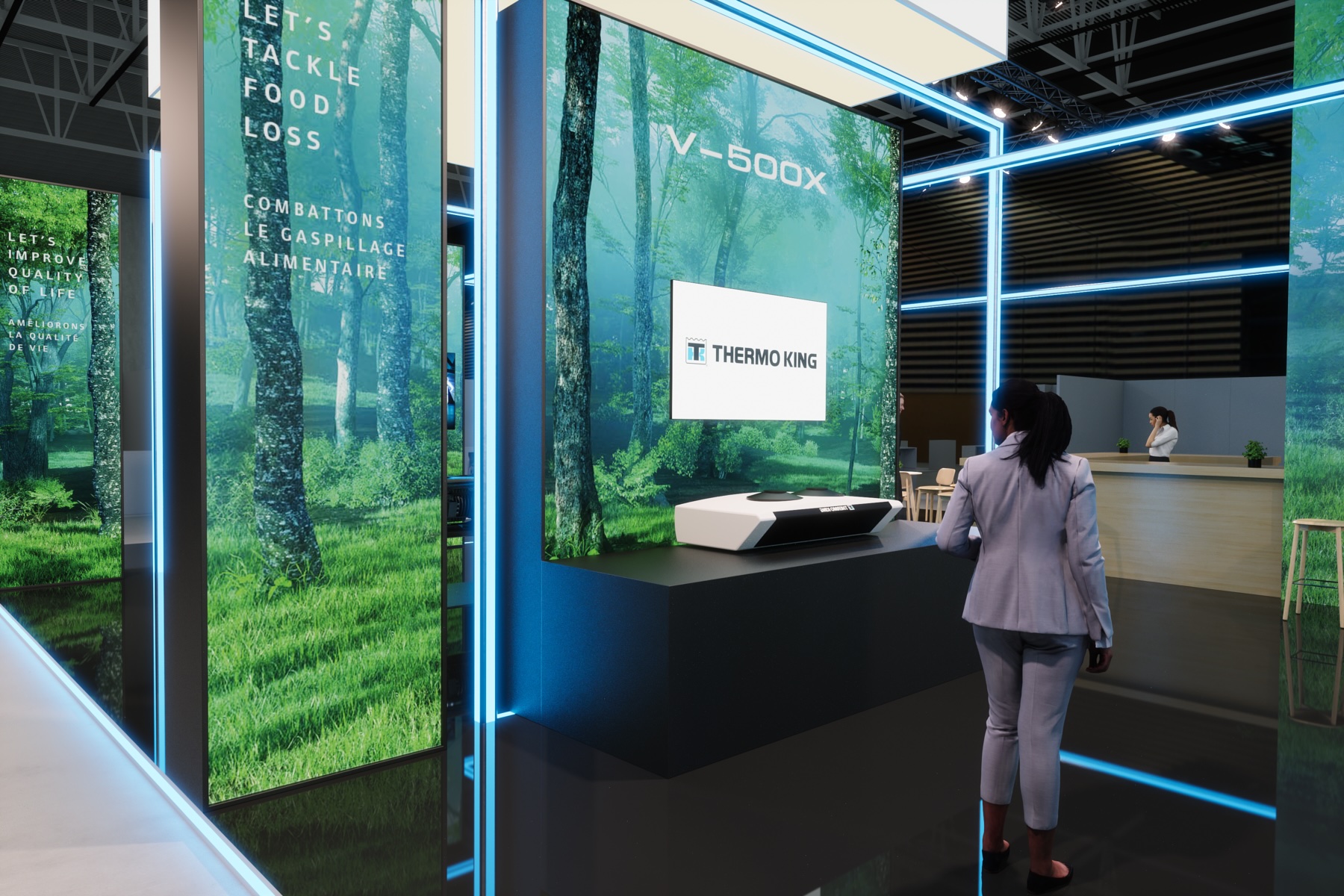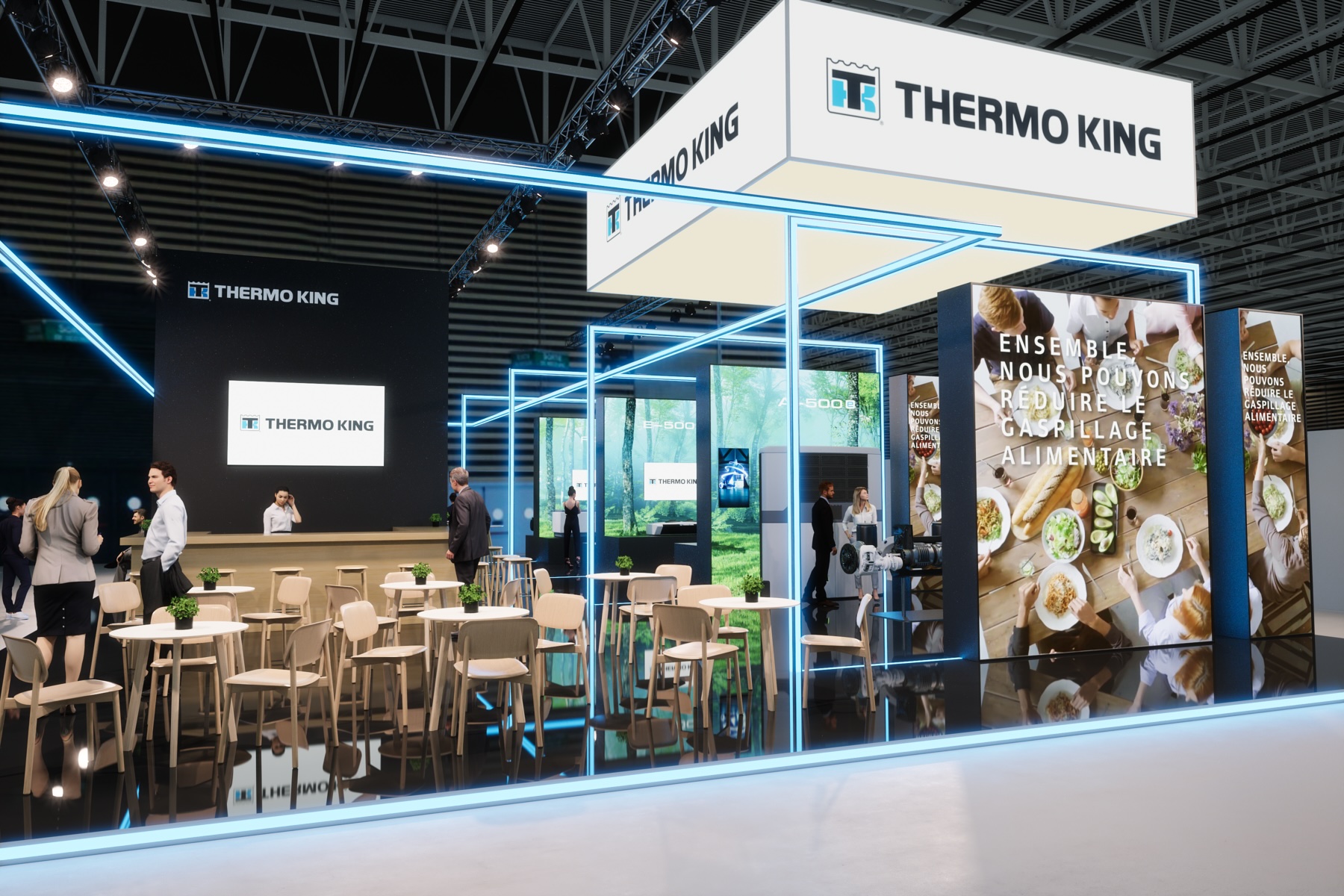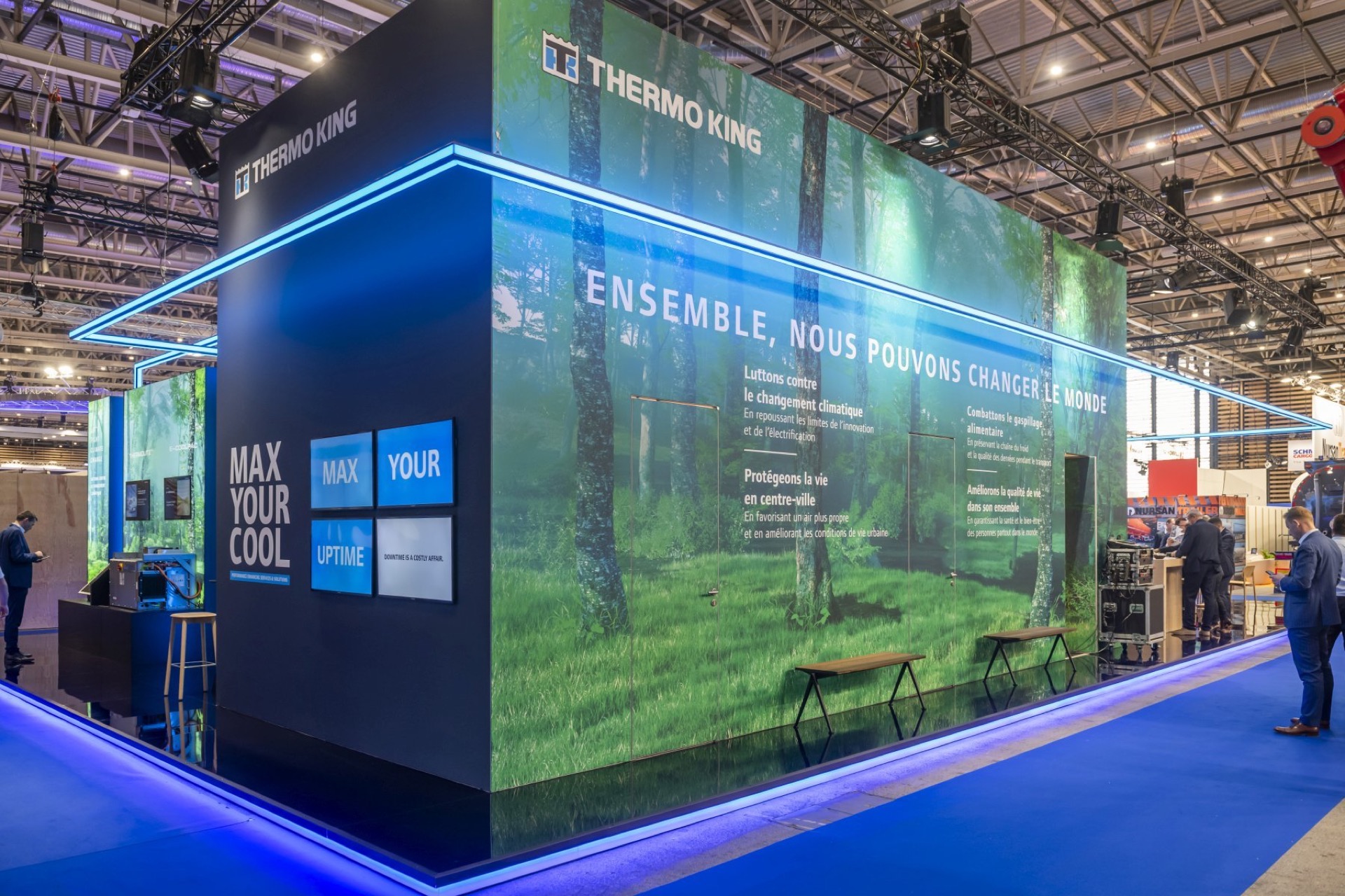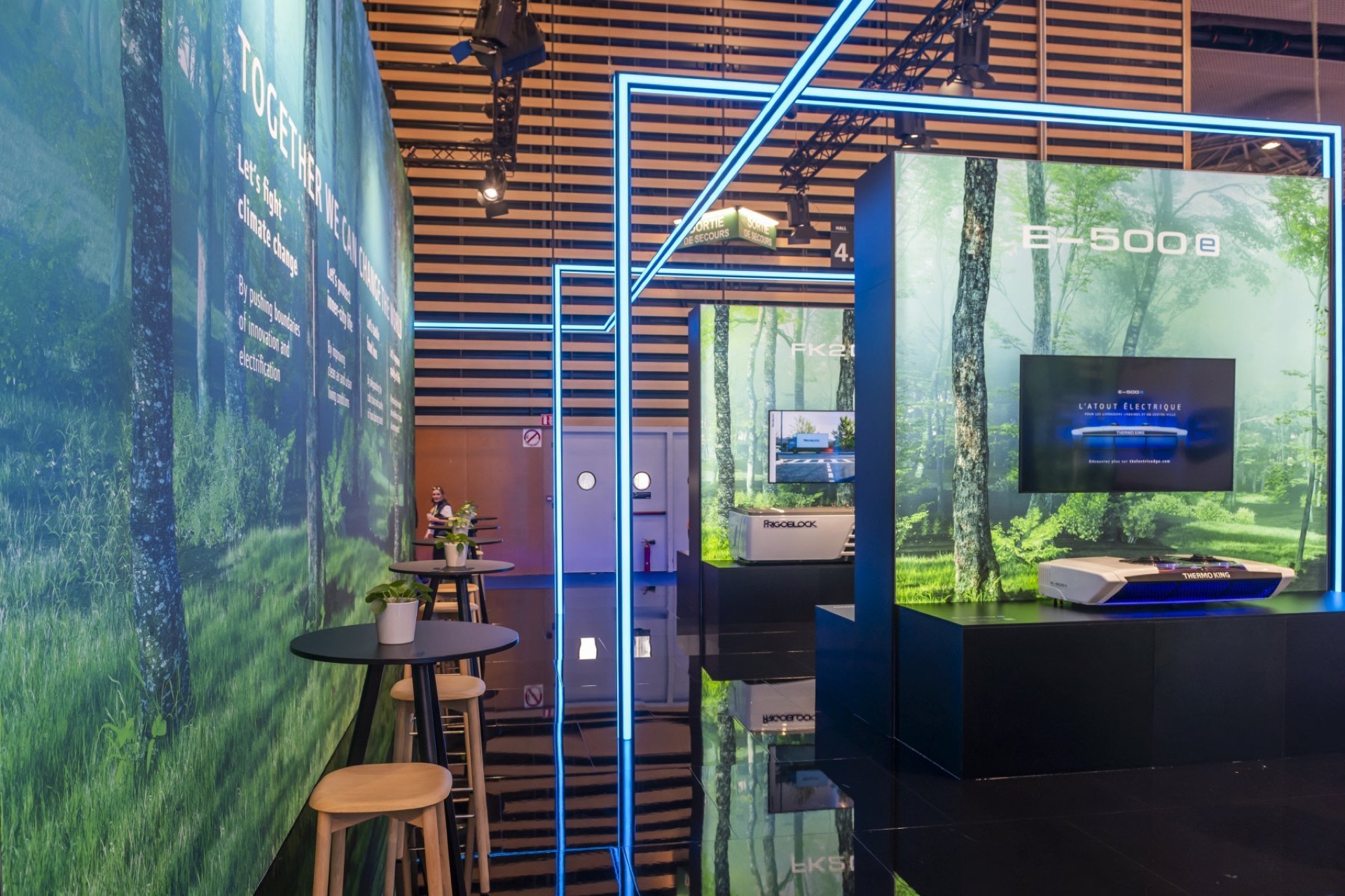 MANYTHINK, as the concept designer, envisioned a light stand design that emphasizes the "all electric" commitment of Thermo King. Featuring LED lines surrounding the units, mirroring on the glossy floor, they guide you through an electric world, intersecting like a drive through the city and suburbs. LED walls add dynamic movement, capturing the essence of refrigeration transport. Enter the e-Zone and change the world!