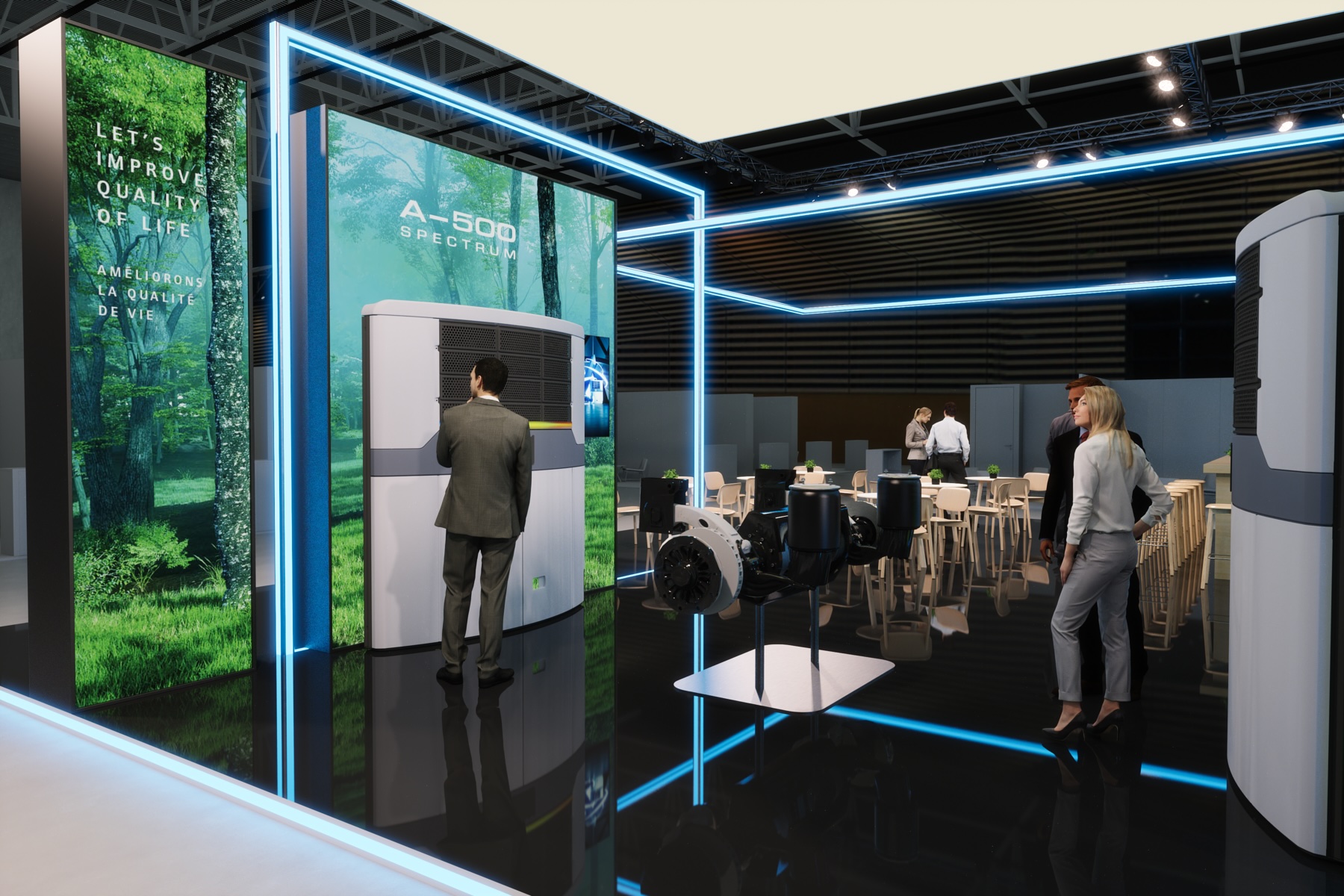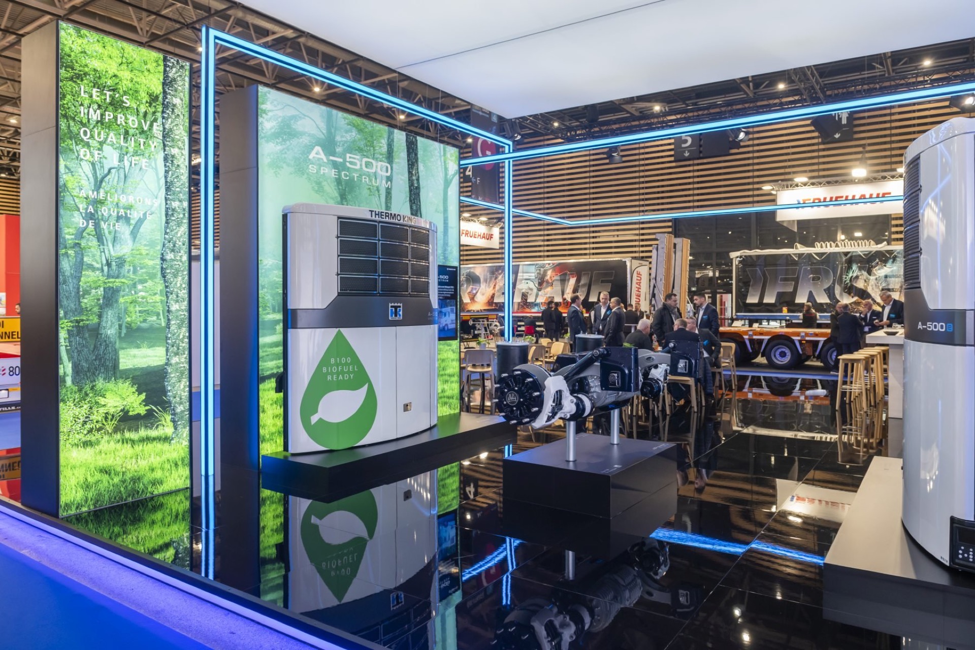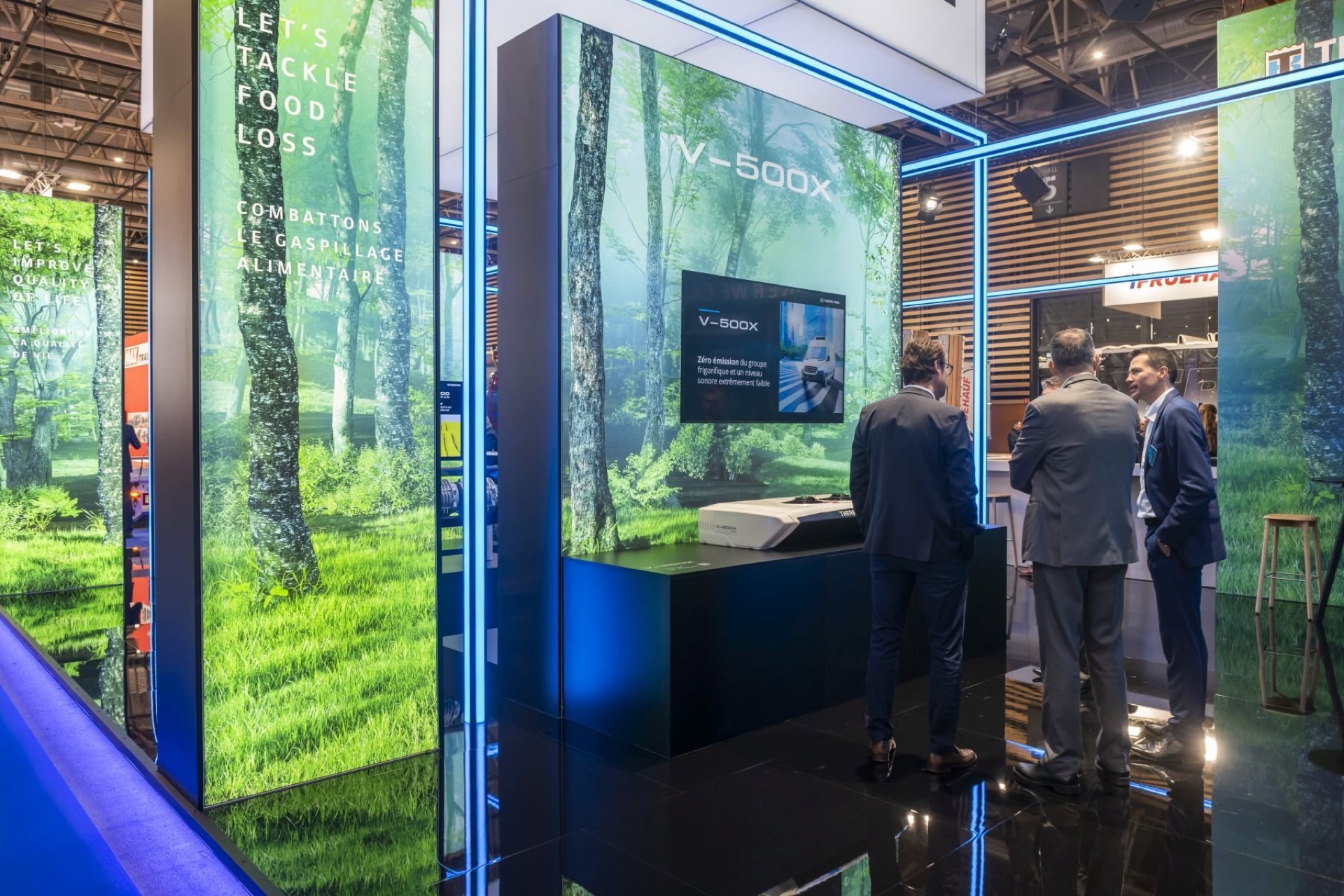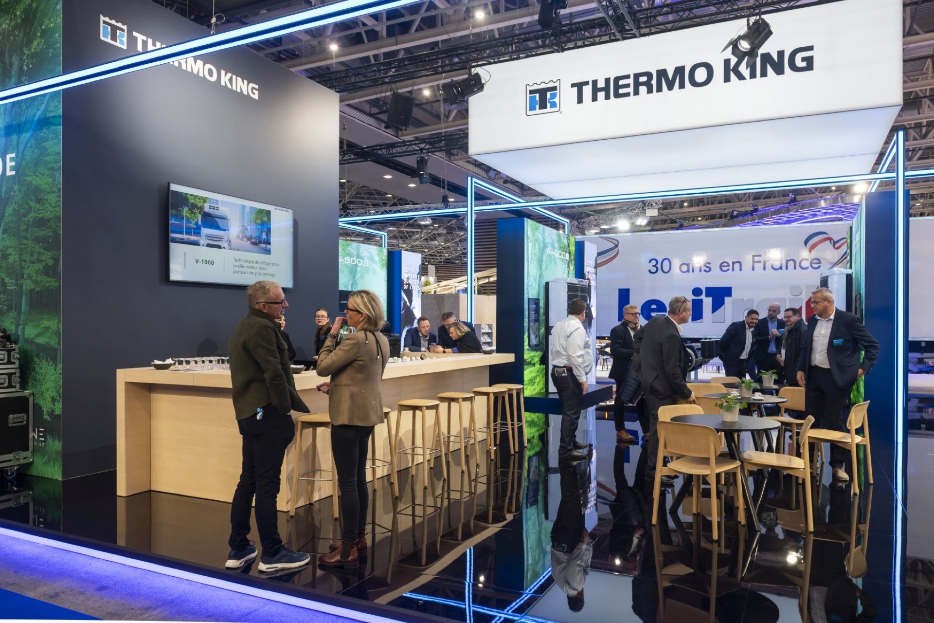 MANYTHINK, as the concept designer, envisioned a light stand design that emphasizes the "all electric" commitment of Thermo King. Featuring LED lines surrounding the units, mirroring on the glossy floor, they guide you through an electric world, intersecting like a drive through the city and suburbs. LED walls add dynamic movement, capturing the essence of refrigeration transport. Enter the e-Zone and change the world!